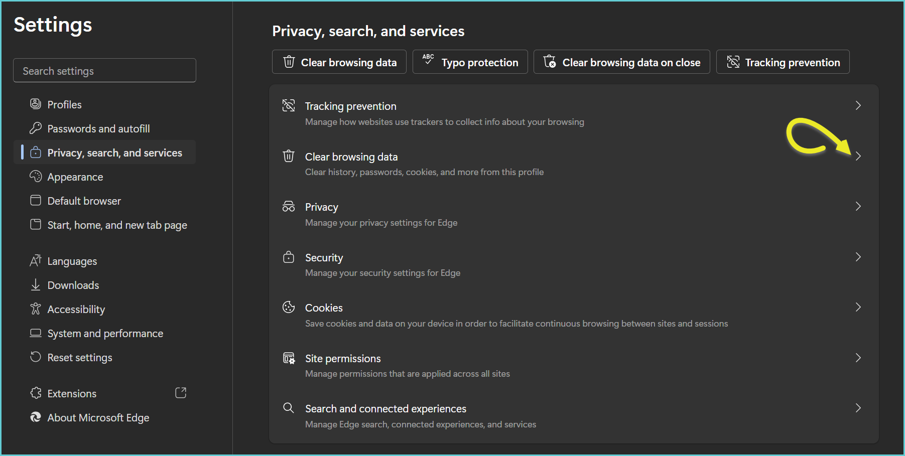 4. From the ‘Privacy, search, and services’ section >> click ‘Clear browsing data’ and click ‘Choose what to clear’.