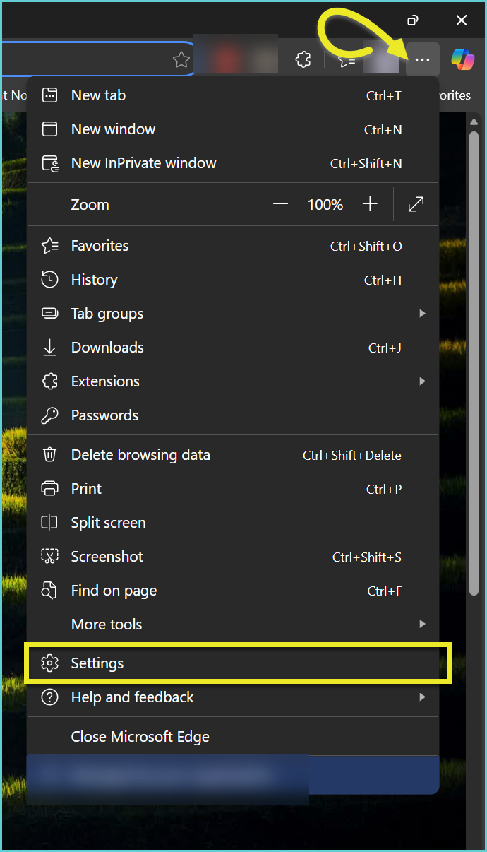 1. In the top-right corner of the browser window, click the 'Settings and more' button -- 3 horizontal dots (•••) -- located in the upper right corner of your browser.