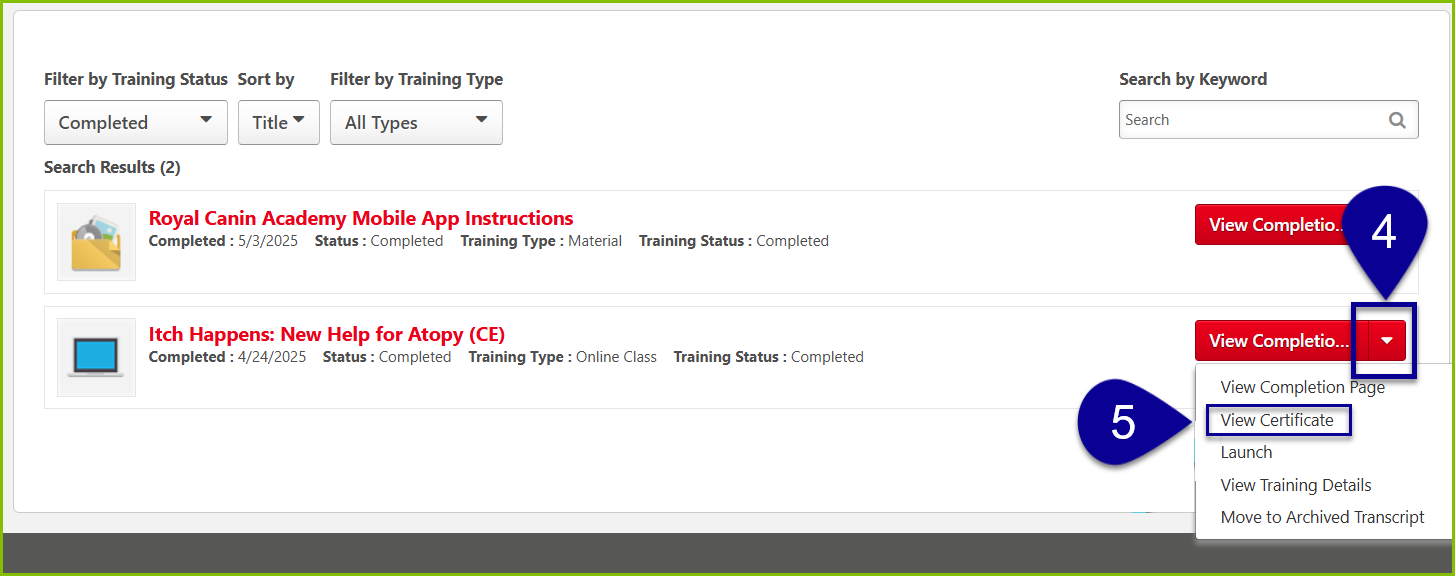 Alternatively, users can open the menu by selecting the hamburger icon (☰) in the upper right corner. Click "Learning" and select "View Your Transcript". Then, change the "Filter by Training Status" from "Active" to "Completed."