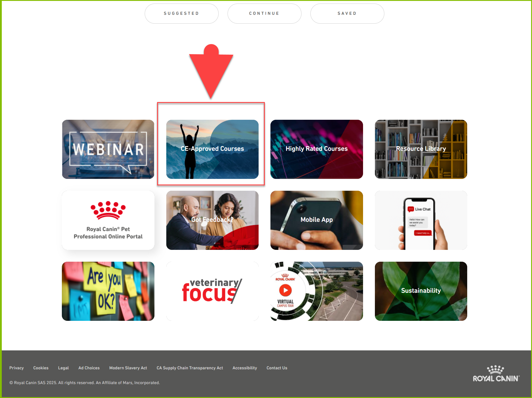 Once logged into Royal Canin Academy, kindly scroll down to the bottom of the home page. There you'll locate the "CE Approved Courses" tile and other catalog options.